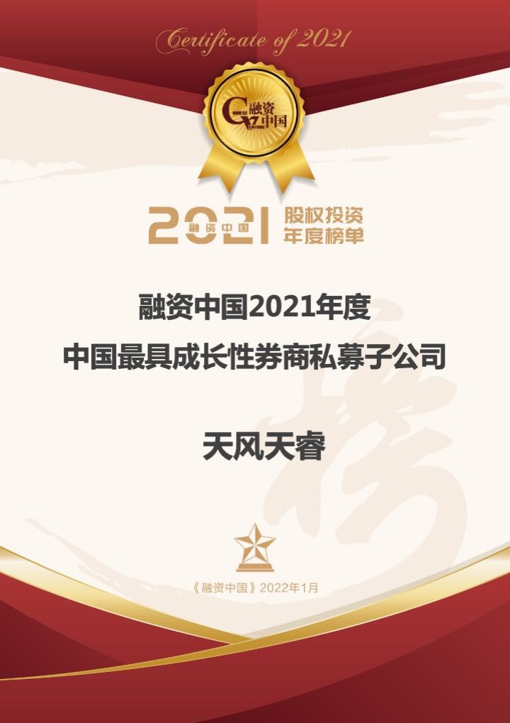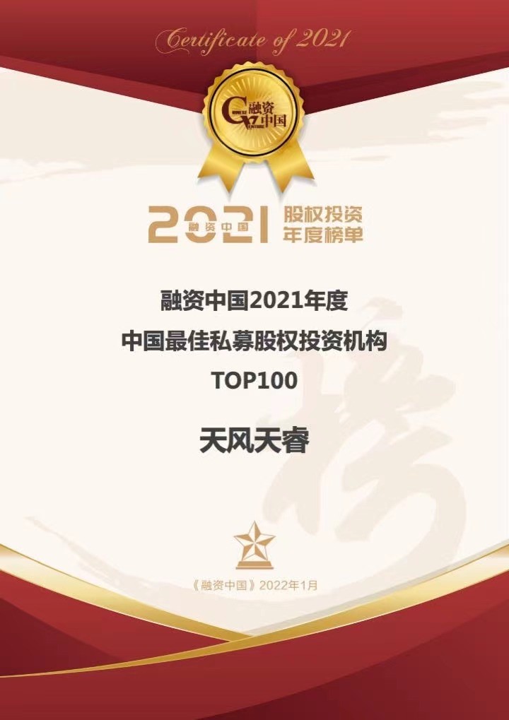 2022年1月12日-13日,以“匠心精神”為主題的融資中國2022(第11屆)資本年會暨頒獎盛典在上海舉行,融資中國2021年度股權(quán)投資榜單于活動現(xiàn)場發(fā)布,天風(fēng)天睿憑借多年積累沉淀與2021年度優(yōu)秀表現(xiàn),連續(xù)第六年榮登“中國私募股權(quán)投資機構(gòu)TOP100”榜單,并攬獲“中國最具成長性券商私募子公司”獎項。
